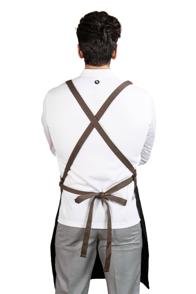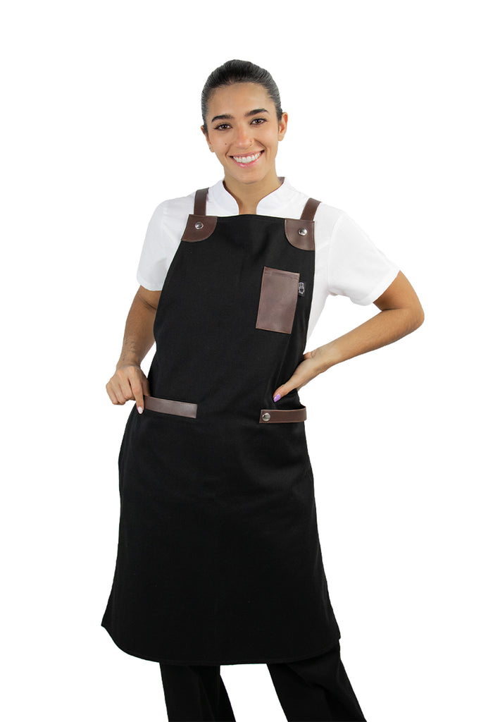 The Chicago Apron is designed with both chest and waist pockets, featuring vinyl details and metal grommets for a modern look. It provides exceptional comfort with cross-back straps that balance the weight and relieve any tension from the neck.